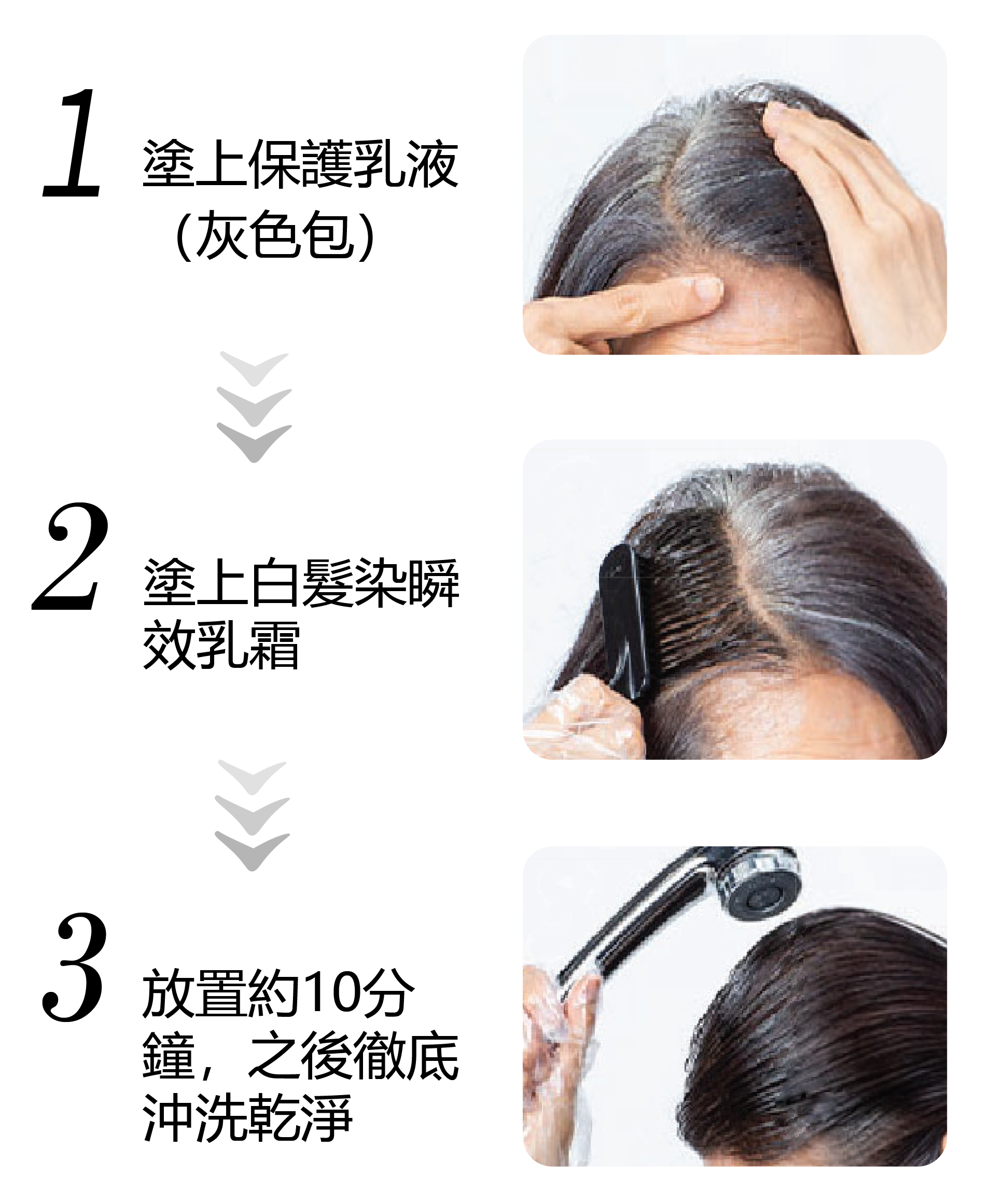 戴上盒內附帶的手套,把適量的瞬效乳擠出於快染梳上,重點塗抹於白髮上